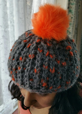 I was so excited that I found the Sirdar Head Start yarn at a discount. I had my eye on this yarn for a while specially since there is a scrumptious pompom and the color is so cheerful and contrasts so well with the grey yarn. I had wanted to try a new knitting technique and the Fisherman's Rib or the Brioche Stitch was top on my list. Now since I wanted to try a complicated stitch I wanted to do it on straight needles. But it took a lot of trawling around the web to find a pattern for a hat on straight needles and that too using the Fisherman's Rib. Here is the pattern I used from the awesome people at yarnspirations.